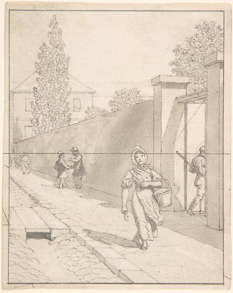 Marie Lambertine Coclers created this print, "Man aan de deur van een herberg," using etching, a process where lines are incised into a metal plate with acid, then inked and printed. The effect is a network of fine lines which describe figures outside a modest inn. This method allowed Coclers to create multiple copies, making art accessible to a wider audience beyond the wealthy. Etching was a technique that democratized image-making. The texture created through etching gives the scene a sense of depth and detail, emphasizing the everyday life of ordinary people. Coclers, as a woman artist in the 18th century, challenged traditional roles. Her choice of subject, focusing on common folk, reflects an interest in the lives and labor of the working class. By understanding the materials and processes behind this print, we gain insight into the social context of its creation, challenging distinctions between fine art and craft.