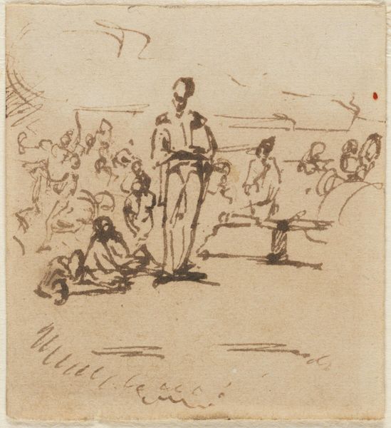 Editor: This is a pencil sketch by William Henry Hunt. It's a simple composition of figures, seemingly on a beach. What strikes me is the casual depiction of these men. How do you interpret this work? Curator: It's tempting to see this as a benign scene, but I'm immediately drawn to the context of 19th-century England. Who were these men? What was their relationship to labor, leisure, and class? Hunt's choice to depict them, however fleetingly, says something about the social landscape he inhabited. Editor: So, you see it as a commentary on social class? Curator: Perhaps commentary is too strong a word. It's more of an observation, a snapshot of a particular social strata at leisure, which in itself is a statement given the vast inequalities of the era. What does the artist choose to show us, and what does he omit? Editor: That gives me a lot to think about when considering seemingly simple sketches. Curator: Exactly. Art is never created in a vacuum, and understanding the context is key to unlocking deeper meanings.