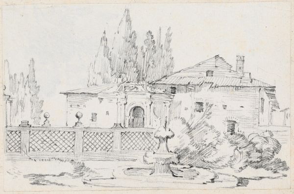 Curator: The artwork before us, created between 1744 and 1750 by Joseph Marie Vien, offers a glimpse of Rome through a neoclassical lens; it’s entitled “Castel Sant’Angelo from the Northwest.” Editor: It's striking. There's a rawness to it, the graphite laying down these immediate, almost brutal marks describing form. The strong shadows give it real depth. Curator: Vien’s depiction of Castel Sant’Angelo serves as a case study in how the city and its monuments were reimagined during a time marked by a return to classical ideals, prompting a new era of archaeological investigation, patronage, and artistic creation. Consider how representations of landscape informed perceptions of Roman identity. Editor: I see the geometry. The planes of that building to the left and the Castel itself. They're almost abstracted by this strong contrast of light and shade. It flattens them. How would you situate Vien's rendering within the picturesque movement? The pencil creates a sort of proto-photographic impression. Curator: By portraying the castle from this particular angle, the artist situates it within a narrative—an intentional gesture towards a monumental legacy appropriated by Papal authority. Look how the dark shading contrasts the sun-drenched heights. Vien isn’t just showing us a monument, he's commenting on the structure of power itself. Editor: The stark rendering also obscures and creates some tension between specificity and generality. It has these little semiotic details – what is being said through a tree represented in such stark contrasts? It creates movement; not just toward something specific in the composition but between different meanings. Curator: Right, there’s certainly a dialogue to be had around what Vien chooses to highlight and, equally, what he obscures, a reflection, perhaps, on the elusiveness of truth. This sketch really encapsulates the dynamic between antiquity, power, and artistic license. Editor: It's more than just topography; it's a meditation on how light and shade alter perceptions. The interplay becomes more fascinating each time.