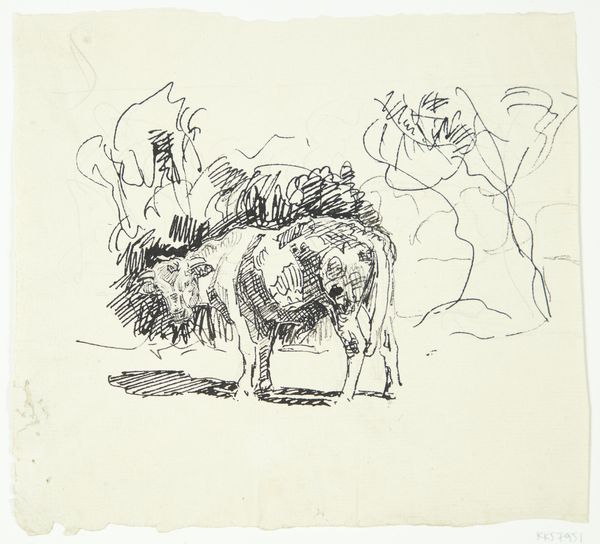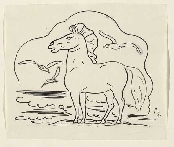 Editor: Here we have "Zonder titel (paard)," or "Untitled (horse)" by Leo Gestel, an ink drawing from between 1925 and 1940. It has a sort of monumental quality despite clearly being on paper. What do you make of it? Curator: The horse, of course, has carried tremendous symbolic weight across cultures for millennia. Power, freedom, nobility – those are some of the obvious associations. But look closer: how has Gestel chosen to portray this animal? Its posture, the thick, almost frantic, strokes of ink... does it still suggest freedom to you? Or something else? Editor: I see what you mean. The way the head is thrown back, it could also suggest resistance. It's definitely not just a serene, classical horse. There's an element of struggle there. Curator: Precisely! The use of black and white emphasizes the drama, doesn't it? Black for shadow and the unknown, white for purity or perhaps surrender, and a constant interplay between the two. In a way, Gestel is presenting us with a duality. Perhaps one reflecting a larger, societal anxiety, even? Think of the interwar period when this was made. Editor: So you're saying the drawing is more than just a representation of a horse; it's carrying deeper cultural meanings, maybe related to the uncertainties of the time? Curator: Visual symbols are rarely straightforward, especially from such a period of dramatic shifts. We project ourselves, our fears, our hopes, onto them. Do you think an audience at the time might have viewed this horse differently from how we do today? Editor: That's really fascinating. I’m seeing so many potential interpretations that I missed at first glance. Thanks for shedding some light on this! Curator: My pleasure. Art's power resides precisely in its ability to resonate differently across time, carrying echoes of its origins and reflecting the evolving perspectives of its viewers.