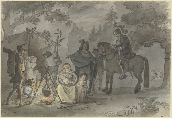 Editor: This watercolor, titled "Cottagers" from 1794 by George Morland, is a peek into what feels like a peaceful scene. The colors are soft, the scene bustling with domesticity. What’s fascinating to me is how it’s a genre painting, but also seems to idealize country life. What do you make of it? Curator: It’s a fascinating image in its romanticism. "Cottagers", viewed through a socio-political lens, presents an idealized vision of rural life popular in Britain during a time of significant upheaval – the French Revolution and the rise of industrialization. Note how the composition focuses on family and leisure. Doesn't it strike you as a carefully constructed counter-narrative to anxieties about urbanization and class conflict? Editor: It does! It’s almost like a fantasy… were scenes like this really common? Curator: Reality for cottagers was likely far more arduous. Morland was, in a sense, participating in a marketing exercise. These scenes had a ready audience among city dwellers longing for an escape and an idealized representation of the British countryside, especially for the rising middle class with disposable income to spend on art. He provides an assurance of stability and virtue residing within the English countryside, perhaps implicitly reinforcing a certain social order. Editor: So, is Morland’s "Cottagers" offering more of a political message than I first thought? Curator: Certainly. Genre paintings are rarely simple depictions; they are cultural texts that often endorse particular values, sometimes to gloss over real problems of the time. In the case of "Cottagers," it presents a visual narrative that suited the anxieties and aspirations of a specific segment of British society during the late 18th century. Editor: I didn't realize how loaded such a seemingly simple watercolor could be. Curator: Indeed, the painting becomes more interesting once we acknowledge that idyllic representations serve political functions. Art is never really separate from society.