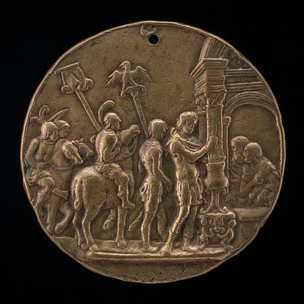 Editor: This is a bronze relief, "Boldù between Faith and Penitence" by Giovanni Boldù, created around 1458. It's incredibly detailed. The composition seems almost violent, but there’s also an angelic figure present. What strikes you about this piece? Curator: The tension between violence and divinity is absolutely key here. Looking at this piece, I am drawn to the intersection of religious belief and societal power structures during the Renaissance. Who decides what constitutes "penitence," and what are the consequences of transgression? Editor: So, you see it as a commentary on power? Curator: Precisely. Notice how the figure being punished is centrally located but powerless. Boldù is making a statement, isn't he, about the very visible consequences of defying religious norms in a time where the church was inextricably linked to governance? Does this brutal representation feel distant or does it echo more contemporary situations? Editor: It is shocking, definitely. In a way it’s still relevant to thinking about power dynamics now and historical ones. Do you see any hope in the scene at all, though? Curator: Hope is a difficult thing to locate here, but the inclusion of "faith," personified by the angelic figure, complicates a straightforward narrative of victimhood. Perhaps Boldù is hinting at a way to subvert power, even from within such a repressive framework. It pushes us to consider how people historically challenged constraints on their freedoms. Editor: I never thought of it that way. I appreciate the nuanced interpretation. It gives a lot of food for thought. Curator: Absolutely! Understanding art in its socio-political moment expands what we understand about current structures too.