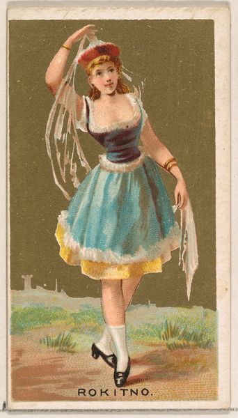 Editor: This is "Scholar, from the Occupations for Women series" created in 1887 by Goodwin & Company, made with gouache, coloured pencil, and print. It has the appearance of a trading card. She looks as if she is celebrating, but… a bit undressed. How should we interpret this? Curator: This piece is fascinating when viewed through a feminist lens. The "Occupations for Women" series, on the surface, seems to celebrate women's roles, but the artist's choices present an odd contradiction. Consider the costuming, or lack thereof, juxtaposed with the title. What does it mean to depict a “scholar” in this way, and for whom was this image made? Editor: So, the artist's intent might not be as straightforward as just portraying women in professions? Curator: Precisely. This image was made for cigarette cards. We must consider the context of commercial art in the late 19th century and how these images functioned to sell a product. Do you see a tension between empowerment and objectification here? Editor: Definitely. The overt sexuality seems at odds with the idea of scholarly pursuit. It almost feels satirical, as if poking fun at the notion of women in intellectual roles. Curator: That’s an interesting interpretation. Perhaps it speaks to societal anxieties around women entering traditionally male-dominated fields, using hyper-sexualization as a means of undermining female intellect. How does that reading sit with you? Editor: That makes a lot of sense! It highlights how advertising could subtly reinforce gender roles even while appearing to acknowledge female progress. Curator: Exactly! Thinking about art in its social and historical context is key to understanding its multilayered meanings, even in something as seemingly simple as a cigarette card. Editor: This has changed my perspective on how to look at even the smallest artworks. Everything is more complicated than it seems at first glance.