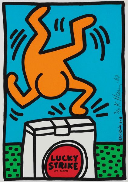 This vibrant print is by Keith Haring, who made a name for himself in the 1980s with his exuberant, cartoonish figures. His images were initially drawn on blank advertising panels in the New York City subway, using humble chalk. This print shares the bold lines and simplified forms of those early works, but translated into a commercial medium. Haring worked with screen printing, a technique that allows for the quick reproduction of images. The flat, unmodulated colors and crisp outlines create a graphic punch, perfectly suited to mass dissemination, with a high degree of control for the artist. Haring sought to break down barriers between art and everyday life, between the museum and the street. The democratic nature of printmaking suited his populist message. His art wasn't just about personal expression; it was about communication, and about making a splash in a world saturated with signs and symbols. Haring understood that art could be a powerful tool for social change, a way to reach a broad audience and spark dialogue.