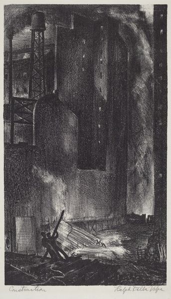 Editor: This etching by Otto August Kuehler, titled "Superstation" from around 1923, presents a rather imposing industrial scene. There’s almost a dystopian feel to the grimy depiction of urban modernity. What's your take on its cultural significance? Curator: This piece speaks volumes about the interwar period. Artists like Kuehler were grappling with the rapid industrialization and urbanization reshaping society. Consider how this print participates in the broader cultural debate, especially among Precisionist and Modernist artists, about technology’s promises and perils. The stark aesthetic embodies a fascination with the machine, but there is perhaps a commentary about the human cost to progress. Editor: Human cost, interesting. The figures seem dwarfed by the architecture. Do you see this piece commenting on power structures at play? Curator: Absolutely. Notice how the elevated perspective of the viewer gives power to the system but also potentially allows one to question its intentions. Who are we looking at this system, how are these scenes being captured and disseminated in the media and through different art institutions, and for what audience were they originally designed? This print certainly reflects and possibly reinforces a specific socio-economic vision of industrial strength. Editor: That gives me a new way to look at this. I was caught up in the aesthetics but hadn’t considered how the institutions contribute to the narrative. Curator: Thinking about the institutions - galleries, publications - helps to understand who benefitted from showcasing these images and whose voices might have been excluded. The cultural dialogue is always incomplete if we don't analyze it critically. Editor: It is unsettling to think of who and how institutions played such a part then. Food for thought.