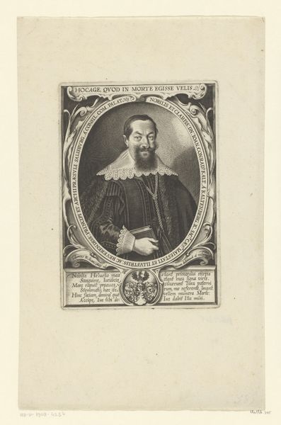 Thomas de Leu created this engraving, 'Portret van Karel III, hertog van Lotharingen,' around the turn of the 17th century. The eye is immediately drawn to the oval frame, meticulously inscribed with the Duke's name. Inside, a portrait emerges, its details finely etched, capturing the likeness of nobility. De Leu’s work functions as a carefully constructed sign. The portrait's formal structure—the pose, attire, and even the elaborate mustache— speaks to the semiotics of power. The visual elements of line and shape converge to create an image deeply embedded with cultural codes of status and authority. The inscription at the base furthers this, adding layers of meaning that engage with broader philosophical concerns about representation and identity. The engraving prompts us to consider how appearances are crafted and how they reflect deeper cultural narratives.