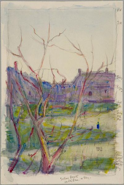 Editor: We're looking at "The Bridge of Beaugency," a gouache on canvas painting by Jacques Villon from 1944. I'm immediately struck by the use of geometric forms and the almost dreamlike quality of the landscape, particularly the yellow sky. What's your take on this piece? Curator: Given the context of 1944, during World War II, I see this painting not just as a landscape, but also a potential commentary on the French countryside amidst conflict. The fragmented, almost cubist style, perhaps reflects the fractured state of the nation. Villon's choice of gouache also hints at a certain immediacy, as if trying to capture a fleeting moment of peace amidst turmoil. Editor: That’s a compelling perspective. The fragmentation feels deliberate now, representing instability. Is there a specific reason Beaugency was chosen, or is it more of a symbolic location? Curator: Beaugency, like many French towns, would have experienced the war's impact directly. Bridges, particularly, are strategically vital and symbolically potent, often becoming targets. Villon might be using this particular bridge to represent resilience and connection, or conversely, vulnerability. Notice the yellow sky – how does that strike you in relation to the events of the time? Editor: It's almost ominous now that you mention it. Initially, I found it uplifting, but considering the war, it feels more like a warning or perhaps even the smoke and fire of conflict in the distance. The vibrant color becomes unsettling. Curator: Precisely. The painting exists in a complicated public and private relationship with its subject. It reminds us that landscapes are never just pretty pictures; they are imbued with history and cultural significance. Editor: This has given me a completely new appreciation for considering historical context when looking at art. Curator: And for realizing that art's beauty can mask deeper, sometimes darker, truths.