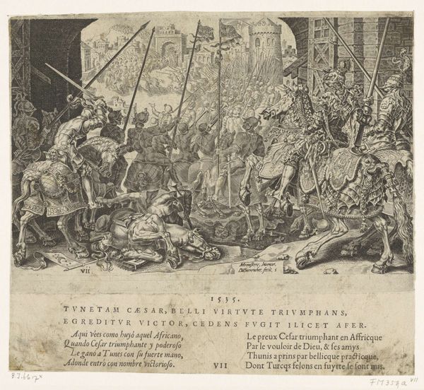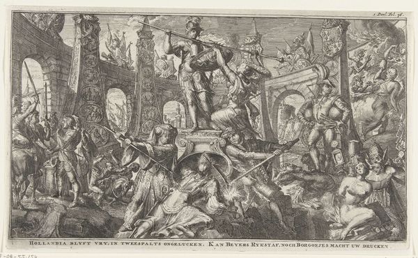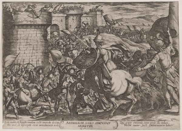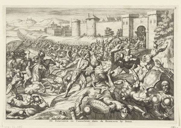 Curator: This engraving from 1572, titled "The Army of Romulus in Combat with the Sabines", comes to us from the hand of Giovanni Battista Fontana and is held in the Rijksmuseum. Editor: It’s incredibly dense! All these figures packed together, almost like a woven tapestry of violence. You immediately sense the chaotic nature of battle through Fontana’s line work. Curator: The sheer intensity is palpable, and it's fascinating how Fontana, through this history painting, visualizes the foundation myths of Rome itself, specifically Romulus trying to reclaim the Capitoline from the Sabines. It serves as a cultural artifact, reflecting the values and narratives the ruling classes wanted to project. Editor: Agreed, and consider the labor involved in an engraving like this. Each line carefully etched, translating a vision of power, perhaps, into a reproducible form. The material of the print allows it to circulate widely, disseminating a very particular version of history and ideal of masculine Roman virtue. It seems the pen, or rather, the burin, is as mighty as the sword here. Curator: Precisely, and it’s no coincidence that printmaking was becoming such a powerful tool in disseminating ideas and political narratives during the Renaissance. The ability to reproduce images and distribute them broadly changes the public sphere. I wonder what messages and power dynamics the choice to focus on this episode reinforced? Editor: Fontana isn't just creating art; he is also manufacturing consent or at least visually bolstering an existing ideology through his work, where materials, techniques, and circulation amplify it. Curator: The detail in the armor, the expressions, and the composition clearly showcase skill, so it served an important ideological function then, reinforcing classical ideals of leadership and Roman exceptionalism. Thank you for considering this aspect, it sheds additional light. Editor: Thinking about this as a designed object meant to deliver these ideals across society certainly helps us to get closer to understanding it.