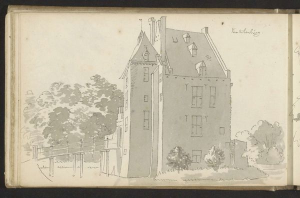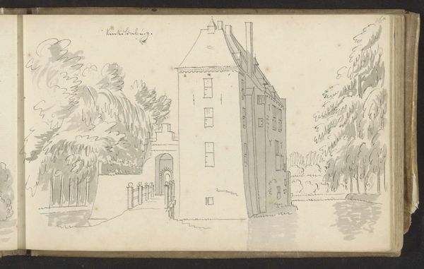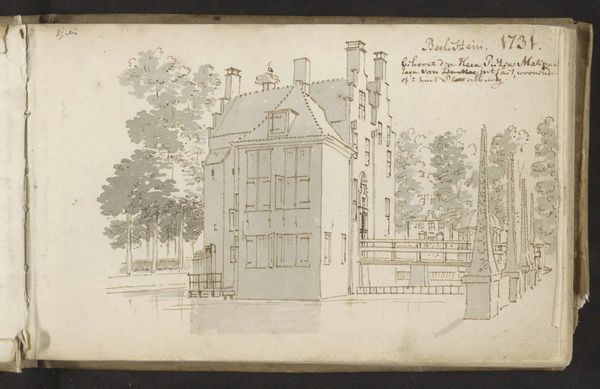 Curator: Look at this fantastic, delicate sketch: “Kasteel Fransenburg te Nijbroek,” likely created between 1732 and 1736 by Abraham de Haen the Younger. Editor: My first thought is: it’s like a visual whisper. Pale ink, scratchy lines... I feel like I've stumbled upon a private thought, doodled in the margin of a much larger story. Curator: Precisely! The work employs pen and ink on paper, capturing the Fransenburg Castle as it appeared in Nijbroek. What strikes me is how such ephemeral lines capture something about Dutch identity through architecture, as a cultural anchor. Editor: I can see that, although there's also a wistful quality to it. Those aged yellows and greys – they’ve imbued it with the character of memory itself, not only representing physical location but emotional. Almost haunted with time and passing, somehow. Curator: That’s interesting, given how architectural drawings, particularly during that period, were instruments for celebrating or re-imagining social structures—displays of status, ownership. Here, we are reminded how these objects fade over time as monuments lose prominence in history and their social meaning shifts. Editor: And then it begs the question: Was he actually commissioned or was this his musing over architecture from his position as the son of a well-known painter? I feel like if the castle were more central in the drawing then the power dynamic could change the reception. What is more important here—nature and landscape or castle and wealth? Curator: I think it does both simultaneously, inviting the audience to do the same! Haen shows the landscape and its context. He's reminding the upper class what is beyond the castle grounds; that is how the upper class of the time also benefited economically from nature, in some ways. It's incredibly balanced. Editor: A fine balance, I think. It invites more questions than answers and suggests that identity and power may always be under revision as time fades history. I’m captivated! Curator: As am I, with a reinforced sense that landscape art then, as now, can offer an amazing record of public, social, and even emotional change.
