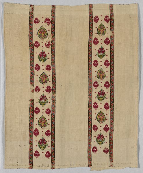 Curator: Here we have an intriguing textile panel dating from around the 20th century. Editor: Immediately striking. It is remarkably spare, minimalist almost, with those blocks of red and simple geometry against the off-white field. Curator: Yes, and while the artist is unknown, the work speaks to traditions of geometric abstraction in textiles across various cultures. Consider its functionality – these panels could’ve been used in many social settings. Editor: The way the red squares form this sort of central spine definitely commands attention. And it's interesting how the verticals reinforce the panel structure, a semiotic scaffolding in the visual space. It’s also crafted from cotton fibers adding texture. Curator: The cotton would impact its use, durability, perhaps even indicate economic status depending on the context. And of course, textiles frequently serve communicative or ritualistic roles depending on the communities making and receiving them. It raises questions about indigenous textile traditions in the region. Editor: I'm most interested in the balance the unknown artist achieves between repetition and restraint. Those little bars of yellow that border the blocks; that gives just enough visual disruption and energy. Curator: And what about the larger social narratives at play? Textile production is frequently a form of communal work, especially by women; how would this function in society? Was this created for the market, personal use or community display? These are very important things that should be considered when viewing it in the context of the museum. Editor: Looking at it again, the whole design is less stern, softened in tone by the cotton base it seems—almost faded in certain lights, or used often. A compelling paradox—simple, yet layered in meaning. Curator: Precisely! It’s a potent piece that sparks questions about utility, tradition and agency. Hopefully this is a tool to ask deeper considerations. Editor: Absolutely! It is something, in its simple design, that demands a careful approach, encouraging us to pause and appreciate it for everything that it is!