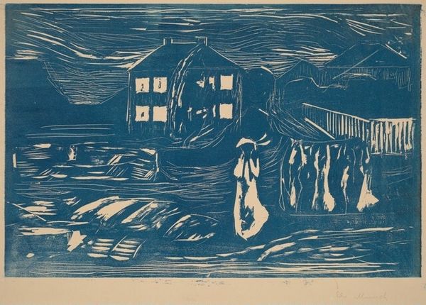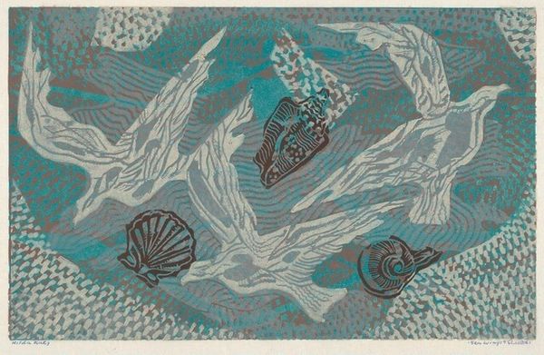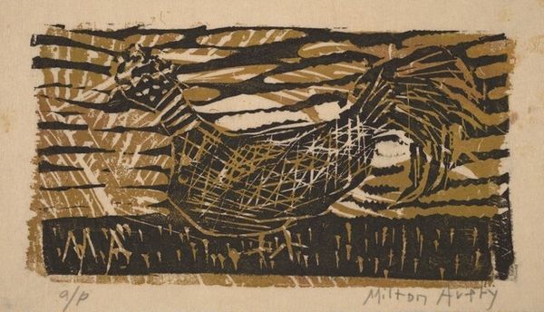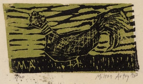 Curator: We're looking at Milton Avery's "Fancy Bird," a linocut print created in 1953. Editor: Striking! That vibrant blue against the creamy paper creates such a stark, graphic image. It almost vibrates. The rough texture speaks of the directness of the process, a physicality that’s compelling. Curator: It's fascinating how Avery reduces the bird to its essential forms, simplifying the natural world through an abstract lens. Consider the bird, a symbol of freedom and spirituality across cultures, here made deliberately unrefined. Is he democratizing the spiritual, bringing it down to earth? Editor: That grid of lines dissecting the bird is really interesting. It’s almost like a cage, disrupting any straightforward reading of "freedom." Perhaps it alludes to containment, the way even in flight, the bird is defined by its environment and its physical form. It makes me think of structuralism. The horizontal lines representing sky or clouds create a similar, flattening effect. Curator: You touch on something important. Consider birds in myth—messengers between worlds. The reduced lines almost empty of color makes this image modern. It can be interpreted as a comment on our fractured modern sense of communication, how easily symbolic meaning dissolves in the contemporary world. What appears “fancy” may be superficial, lacking the richer symbolic associations of past representations. Editor: Right! The “fancy” could even be ironic, given the bluntness of the technique. It avoids easy sentimentality. It challenges our ingrained cultural assumptions to find beauty, depth in what appears rudimentary and two-dimensional. That high contrast of color emphasizes those planes of color to create more dramatic contrasts within what initially seemed only a light subject matter. Curator: I agree. The tension between representation and abstraction becomes key. It highlights the subjective lens through which we perceive symbols. That one powerful color says it all. Avery distills our very ideas of "bird-ness," "sky-ness." He isolates what it is about these symbols, archetypes. Editor: The roughness itself adds layers, it makes us acutely aware of materiality of art. From one viewpoint, it's about a humble bird. But then the formal components reveal more! The stark geometry opens onto considerations that involve so much deeper concepts! Curator: Ultimately, Avery gives us a symbol in progress, an open question, and a space where we can explore our individual connections to universal concepts. Editor: And where the physical properties amplify the mental properties. The material is part of the story it evokes!