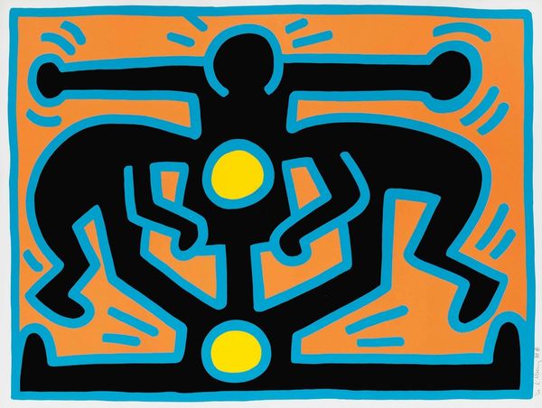 Curator: Here we have "Growing #5" crafted in 1988 by Keith Haring using print and acrylic paint. What's your initial take on this burst of color? Editor: Honestly, pure kinetic joy. It feels like a visual shout of celebration, doesn't it? A playground on canvas. Curator: Absolutely, there's that iconic energy. Look closely at how Haring uses thick black lines to define these figures; notice the contours create this kind of visual vibration. And the way the colours pop—the pure reds, yellows, and blues—creates such a stark contrast to how shapes repeat and interplay against each other. What do you make of it? Editor: Well, those colors and those radiating lines, the geometric undercurrent…it's almost hieroglyphic, a language made of shape and color. But also reminds me of urban art—a kind of symbology speaking from the streets. Is it really just about simple "growing" up? Curator: Well, considering Haring’s socio-political engagement in the late '80s, it's perhaps too simplistic to only see growth. Given Haring's activism about, for example, HIV, maybe this is a defiant cry of life, survival, regeneration amid intense hardship, painted large and joyful. Almost forcing you to stare and confront reality. Editor: It's true, seeing those simplified forms—what looks like a central figure and other supportive structures almost—framed like that really amplifies the sense of pushing against darkness. Curator: The crude-but-expressive marks push beyond pure formalism into emotionally-charged representation. How his abstractions somehow contain recognizable life. And just those small details, how all of it can be seen on so many levels depending on your point of view, it is rather powerful. Editor: Yes, it has stayed with me longer than I would have thought... a vibrant protest and statement all at once. Curator: And perhaps its ongoing cultural legacy stems from this dynamic contrast of style and content? Editor: Precisely, one that perhaps still has something left to say.