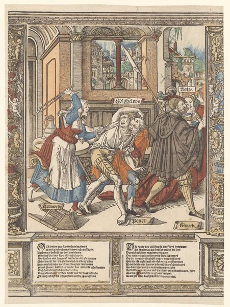 This small Valentine card, by an anonymous artist, presents a tableau of holiday merriment rendered with a restricted palette of primary colours, heightened by touches of gold. The symmetrical composition, anchored by a backdrop of stylized architectural elements, evokes a stage-like space. On the left, a female figure observes with folded hands, echoing the animated gestures of two figures center stage beneath the mistletoe, while another on the right points, perhaps in jest. The characters' garments are delineated with sharp lines and flat planes of colour. These formal elements serve not merely as descriptive devices, but as symbolic markers. The stylized flatness challenges traditional perspective, inviting a reading where surface and symbol take precedence over spatial illusion. The limited palette and precise lines are not simply aesthetic choices, but are part of a visual code reflecting the cultural values and social rituals of its time. The card’s formal structure then, is both decorative and deeply communicative. It invites viewers to decode the underlying cultural narratives embedded within its visual language.