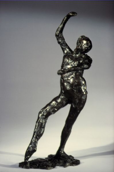 Editor: This striking bronze sculpture, known as "Untitled" by Bahman Mohasses, really captures my attention with its strange geometric figuration. The smooth, almost polished surface is so interesting. How can we consider this artwork? Curator: Well, considering the material reality, this bronze casting implies a whole chain of labor. The artist's hand in sculpting the original form is only the beginning. What about the foundry workers? The extraction of raw materials? Editor: I hadn’t thought about the laborers involved beyond Mohasses himself. So, this finished “art object” is actually a document of sorts? A record of industrial and artistic practices? Curator: Exactly! Think about the accessibility of bronze as a material too. Was this a conscious choice linked to ideas about democratization of art production, or was the ready availability of bronze at play? And note how the "finish," the surface, draws attention to its object-ness. Do you see how the statue almost presents itself as an aesthetic product? Editor: The artist chose a rather polished bronze, making it very refined. Curator: Precisely, the interplay between the "rough" origins of bronze, its material extraction and smelting, and the final sleek surface reveals how value is literally manufactured. Even the Modernist style could be viewed through the lens of material efficiency and standardization of production in early-mid 20th Century society. Editor: So, we’re really unpacking the means of production rather than just appreciating the aesthetic outcome? Curator: Indeed. The labor is not simply a precursor but is fundamentally *in* the artwork, structuring our understanding of it. Consider too where Mohasses fits within an Iranian social context as part of this reading. Editor: That adds such depth! I see the piece very differently now, understanding how intertwined the artwork is with industrial and social factors. Curator: Yes, and by analyzing the making we are also questioning art’s conventional separation from the everyday realities of labor and material consumption.