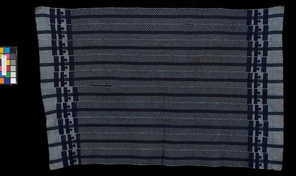 Editor: Right, next up we have Djege Coulibaly's 'Blanket' from 1985. It's made of cotton, through fibre art and weaving techniques. The stripes are just so captivating, and the geometric patterns feel ancient. How would you begin to unpack the meaning behind this? Curator: I think we have to start with understanding its materiality. It’s crucial to consider how this woven cotton blanket operates within a specific social context. The production itself, the labor involved in creating it, tells a story. Editor: What sort of story do you think it tells? The artist? The culture? The owner of this blanket? Curator: All those narratives intertwine here. Cotton as a material carries immense historical weight, doesn't it? We see its connection to global trade networks and exploitative labor practices, alongside local West African weaving traditions. The blanket form also brings up labor and commodity, and perhaps speaks of domesticity as an object. Does the 'blanket' challenge the Western definitions of ‘art’ by foregrounding both utility and aesthetics? Editor: So, its value extends beyond visual appeal. You're pointing out that we should examine its raw material and its making, weaving it all into historical events, challenging a common "art for art's sake" idea. Curator: Exactly. The geometric abstraction, which might initially seem purely aesthetic, could reflect symbolic systems deeply embedded in the artist’s culture. Furthermore, what does it mean to see a traditionally functional and hand-made object displayed in a museum setting? Does it elevate or strip it of its original intention? Editor: That's fascinating! I hadn’t considered the shift in context affecting its interpretation. I'll definitely be looking at the materials and the "making" of artwork in new ways moving forward. Curator: Considering these objects are charged by the labor, material and cultural setting provides the richest viewing experience.