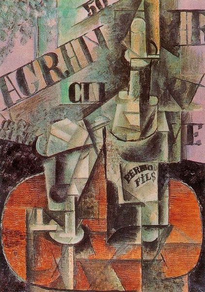 Curator: Ah, here we have Pablo Picasso's "Bottle of Vieux Marc, Glass and Newspaper," created in 1913. It resides here at the Centre Pompidou in Paris. Editor: It feels deliberately fractured, almost anxious. A pile of deconstructed shapes rendered with pasted paper and drawing… are those newspaper clippings layered into the composition? Curator: Yes, that's correct. This is a mixed-media collage, blending paper, newspaper, and drawing to construct a still life. See how he takes these everyday materials and transforms them? It's like visual poetry using the mundane. Notice "Vieux Marc" suggesting old brandy, connecting to archetypal scenes of Parisian café culture. Editor: The "Le Journal" clipping implicates its function— cheap and available for production. But the juxtaposition of a cheap daily newspaper and stylized decorative wallpaper evokes for me the domestic sphere merging into the public sphere... like domestic anxieties of the era played out daily for consumption. Curator: Indeed. This fragmented newspaper evokes contemporary anxieties as Europe was plunging toward war. Picasso, by dissecting and reassembling these ordinary elements, invites the viewer to question reality. Look closely at the dark contouring behind the bottle, evoking almost shadow puppet-like silhouettes. It’s less about direct representation and more about the evocation of concepts through symbolic association. Editor: It’s a stark contrast. On the one hand, we have a sense of refinement: fine spirits, elegant wallpaper. On the other, the rawness of paper, the mass media newspaper – which were being printed quickly and without artistry, serving the lowest common denominator. This intersection exposes hierarchies inherent in objects themselves. Curator: It certainly presents an unraveling of conventional imagery, with the artist deliberately creating a tension between recognition and abstraction. There's something profoundly unsettling about that teetering sense of precarious balance among these objects. It's as if we're not quite able to see the whole story, that is how historical ruptures feel like, am I right? Editor: Absolutely. It’s an enduring question: How do artists repurpose readily-made, functional materials into artistic representation in order to comment about societal pressures? That kind of exploration—the making of meaning— is an alchemic process of taking materials that could otherwise be invisible to most consumers. Curator: Looking at this piece from the viewpoint of visual heritage can open us to the study of signs as carriers of layered memories over time, just waiting to be decoded. Editor: Yes, it really shows how deconstructing material can expose inherent assumptions about art and culture— what can be and what can be said through art.