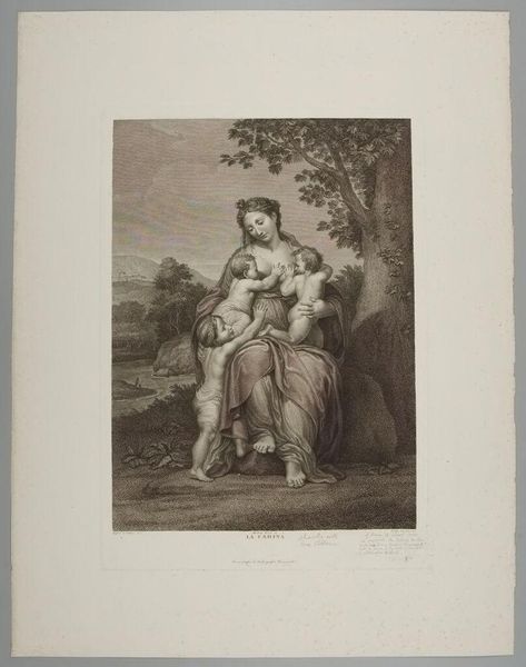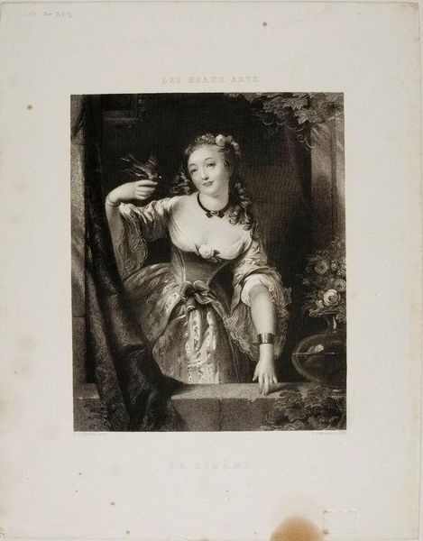 Editor: This is S. Cecilia, an engraving by Lumb Stocks. There's a serenity in her expression, and the presence of the angel is quite striking. What do you make of this piece? Curator: Lumb Stocks positions Saint Cecilia, the patron saint of music, in a way that asks us to consider the power dynamics at play. Note how the angel is almost directing her music. How might we read this in light of the limited roles afforded to women in artistic expression during the 19th century? Editor: That's a compelling perspective! It casts the image in a completely new light. Curator: Indeed. It invites us to examine the historical constraints shaping both the subject and the artist's choices. Editor: Thanks! I'll keep that in mind as I study more art. Curator: You’re welcome! This work allows for critical conversations regarding agency and representation.