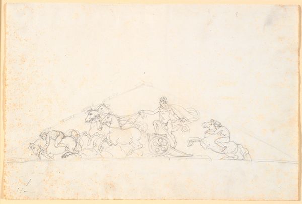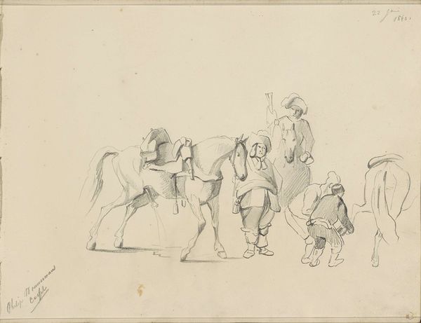 Editor: Welcome, everyone. We're looking at Pieter Bartholomeusz. Barbiers' ink drawing, "Familie met kinderen die schoonmaken," which translates to "Family with children cleaning," dating from between 1782 and 1837. I’m really struck by the division of the image. There is such a clear grouping to each side – family life to the left, almost folklore fantasy to the right. It feels a bit… fragmented. What catches your eye when you view this piece? Curator: Immediately, it's the contrast of line quality that commands my attention. On the left, the family grouping exhibits delicate, almost skeletal lines, suggesting a fleeting or perhaps idealized representation. Notice how those lines capture gestures, but without firm definition of form. Compare this with the more deliberate, heavily outlined figures on the right side of the composition. Their shapes and detail are accentuated, seemingly weighty compared to the light ethereality of the familial scene. This visual dichotomy implies two separate realities within a single pictorial plane. Does that resonate with your initial reaction? Editor: It does. So, the line weights emphasize that separation. The fairy tale side appears more assertive due to the boldness of line? Curator: Precisely. The density of line impacts how we perceive depth and volume, and indeed the symbolic meaning of each group. Are we seeing fantasy contrasted with reality, or is the artist making some broader statement regarding the nature of visual representation? Editor: That’s a great point, especially considering this work exists in a period we associate with Romanticism. Perhaps he is romanticizing domestic labor by presenting two realities or possible lives coexisting in one artwork. Curator: Exactly! Notice the almost diagrammatic quality of the familial scene versus the narrative solidity given to the folkloric. Consider also the very limited tonal range. The artwork invites inquiry into the essence of form itself and how the viewer assembles distinct lines into representational ideas. Editor: That’s fascinating. It definitely changed the way I view the artwork – seeing beyond just the scene and thinking more about the elements and principles of art, like the importance of the artist’s choices around line!