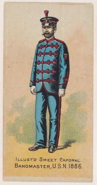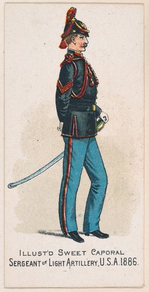 This lithograph was created in 1886 by the Kinney Brothers Tobacco Company as part of a series of promotional trading cards for Sweet Caporal Cigarettes. At first glance, the image presents a dignified portrait of a Sergeant in the U.S. Army Signal Corps. But it’s impossible to ignore the context of its creation: the commodification of military service through tobacco advertising, and the insinuation of military ideals into everyday life. The late 19th century was a period of intense industrialization and expansion, which involved the violent subjugation of Native American populations, and Jim Crow laws enforced racial segregation in the South. Consider how this image serves as a subtle endorsement of the military's role in these processes, normalizing a culture of authority. Cigarette cards like these were widely collected, particularly by children, embedding these values into the popular consciousness. It prompts us to consider the cost of these images, and the legacy of power they represent.