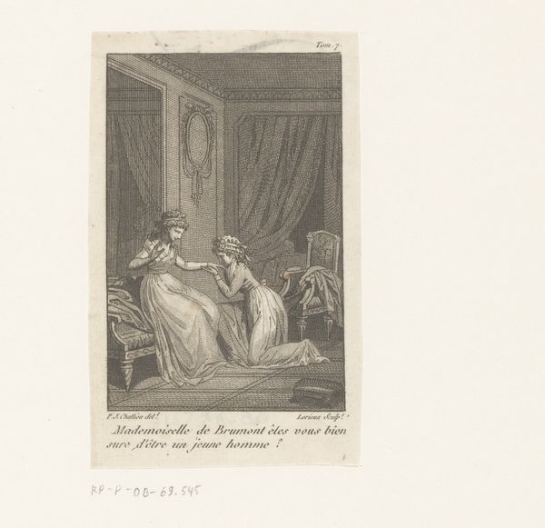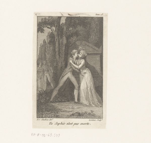 Curator: Immediately striking, isn’t it? The engraving, entitled "Man en vrouw in omhelzing"—"Man and woman in embrace"—dates back to 1791 and is by F.B. Lorieux. Editor: It's very…charged. I get a sense of urgency from the figures. The composition itself, the way she seems to rush in on him, almost interrupts his melancholy pose, it evokes something tempestuous. Curator: Yes, that romanticism style shines through, especially given the theatrical nature of the scene, and the way their emotions are so explicitly displayed in their postures. This period reveled in those dramatic personal narratives. It's interesting to think about what this "embrace" represents. It's definitely a symbolic crossroads. Editor: Crossroads indeed! Is this reunion born of true love, or does her ornate hat and trailing dress imply something more politically performative? Almost like a stage play happening within the domestic sphere. The fact that she’s making the first move also makes you wonder about how gender dynamics and power played out during that time. Curator: Intriguing question! Their clothing could very well reflect the ideals or aspirations of a particular social group, possibly referencing Enlightenment-era political ideals of freedom and equality finding their way into personal relationships. Or, even more simply, a reflection on social standing, and prescribed codes of social etiquette, defining emotional display in relationships. Editor: Precisely. Engravings such as this were, after all, widely disseminated. And the explicit reference, from P.J. Challiva's script “Dès que tu le peux tu m'échappes, et je ne me lasse pas de venir à toi la premiere.” “As soon as you can you escape me, and I never tire of coming to you first," also points towards that. This would be an image immediately accessible and relatable, in particular, for the rising middle classes. Curator: Definitely. Images like these functioned as a moral compass and mirror, reflecting anxieties or aspirations back at society, reinforcing values, through narrative depictions of love and drama. And in the context of Romanticism's focus on personal experience and emotional intensity, one finds encoded a deeper understanding of societal values. Editor: It serves as a stark reminder of art’s pivotal role in mirroring social and cultural currents, illustrating how personal stories weave themselves into the bigger tapestry of political life. Curator: Indeed; this print provides a snapshot of social ideals, personal conflicts, all framed within a carefully constructed visual narrative, that reveals deeper insights on humanity through symbolism and emotions.