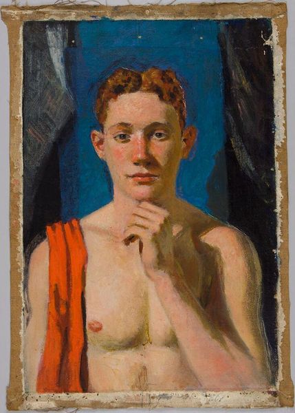Editor: This is Denman Waldo Ross's "Portrait of a Young Man in a Sailor Suit" at the Harvard Art Museums. It's an oil painting, quite intimate in scale. There's a directness to his gaze that's striking. What can you tell me about this work? Curator: Sailor suits were popular for boys of various social classes at the turn of the century, and portraits like these were commissioned to memorialize their youth and innocence, but it also reflects the growing influence of naval power and national identity. Ross might be commenting on the romanticization of military service. Editor: So, the seemingly innocent portrait carries a heavier, more political meaning? Curator: Precisely! It makes us think about how even personal portraits are shaped by the broader social and political landscape. Editor: That's fascinating; I'll definitely look at portraits differently now.