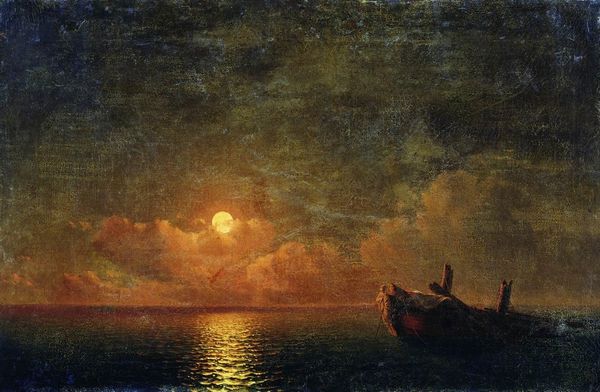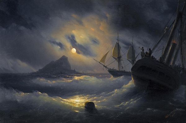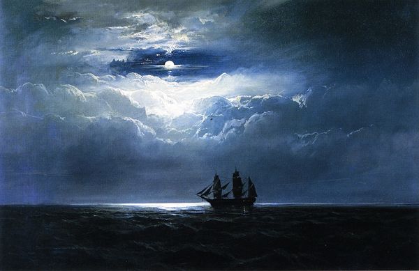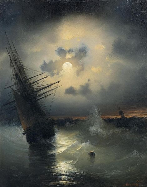 Ivan Konstantinovich Aivazovsky captured this ‘Storm at Sea on a Moonlit Night’ using oil on canvas. The scene is dominated by a tumultuous sea, rendered in thick, gestural brushstrokes, with a dark, brooding sky above. A solitary ship, caught in the storm's throes, lists precariously, its sails barely visible against the overwhelming power of nature. Aivazovsky masterfully employs the Romantic sublime through his dramatic use of light and shadow. The moon, veiled by clouds, casts an ethereal glow, contrasting with the deep blues and grays of the water and sky. This contrast creates a sense of depth and emphasizes the vulnerability of the ship amidst the storm's vastness. The artist also plays with the concept of the picturesque, framing the chaotic scene within a composition that is both visually arresting and emotionally stirring. Ultimately, Aivazovsky invites us to contemplate humanity's place within the grandeur and indifference of the natural world, a theme that continues to resonate today.