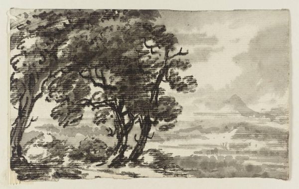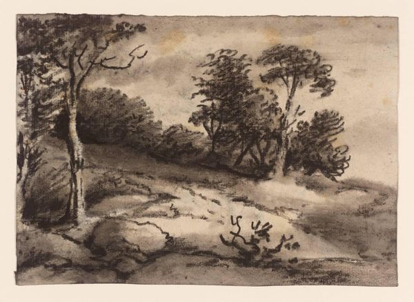 Curator: This is Dr Thomas Monro's "A Cottage in a Glade," held here at the Tate. Editor: It feels so fleeting, almost dreamlike. The soft grays create a hazy, melancholic mood. Curator: Monro, active in the late 18th and early 19th centuries, was known for his influence on landscape painting. He hosted a sketching society where young artists could study and copy his works. Editor: Interesting, so it's not just a landscape, but also a kind of social landscape, a product of artistic mentorship and influence. It makes me think about who had access to these spaces of learning, and whose stories aren't represented. Curator: Absolutely, and the rapid, loose brushstrokes suggest an emphasis on capturing a mood or feeling rather than precise detail, reflecting the picturesque aesthetic of the time. Editor: It is a quiet little scene, but it whispers about the power dynamics within the art world then, and arguably, even now. Curator: A reminder that even the simplest image holds layers of meaning. Editor: Indeed, a dialogue between nature, artifice, and access.