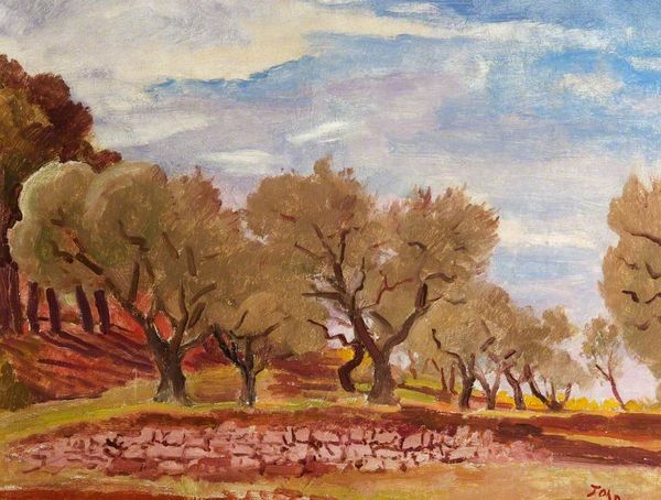 Curator: Here we have "Trees," a tempera on paper work crafted by Konstantin Bogaevsky in 1935. It captures a sylvan scene bathed in dappled light. Editor: Oh, wow. My first thought is "peaceful escape." The soft washes of color feel almost like a memory of a perfect afternoon. There's something inherently nostalgic here, isn’t there? Curator: I think so. Given Bogaevsky’s history, it’s difficult not to view landscapes through a political and historical lens. Remember that he lived through intense periods of upheaval in Russia; this landscape style might be interpreted as a desire for a more idyllic past, a sort of rejection of Soviet industrialization. Editor: Ah, that adds another layer, doesn't it? Seeing those delicate trees now, I'm thinking about resilience, about the silent witnesses to history. Plus, there’s a beautiful tension – the realist technique capturing what’s *there*, grounded to the artist’s sentiment, wanting to escape. What’s your view of it? Curator: That resonates. It fits within an intersectional view where we question whose idyllic past is being invoked and at whose expense? I wonder about accessibility. It feels less radical resistance, and perhaps more, a subtle act of quiet defiance via nature...an almost apolitical resistance to state’s ideals and a yearning to reclaim cultural heritage. Editor: I completely see that. I think for me it’s in how each of the trees feel individually realized. Do you see how different they all are? As a composition this piece is simple, yet also a window to seeing individuals surviving— and maybe standing up. Curator: Yes, looking closer I noticed how the layers of light seem to illuminate certain paths – emphasizing particular moments of growth over others – in relation to our experience, inviting us to find and follow our paths, whether physical, historical, or personal, even or perhaps particularly if they are overlooked. Editor: Right? Okay, so I'm ending up thinking not just nostalgia, but hope...and stubborn, silent survival. Curator: Indeed. The power of the unseen resilience and silent hope within oppressive systems often whispers louder than more overt revolutionary acts. Editor: Well, that's given me a whole new appreciation for this little landscape. I won’t ever look at watercolor trees the same.