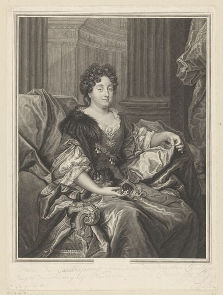 Editor: So, here we have a print from 1794 entitled *Portret van Marie Antoinette*. From what I understand it’s an engraving. I'm struck by how detailed the textures are – the lace, the fabrics... it seems to emphasize Marie Antoinette's status, or at least how she wanted to be perceived. What stands out to you? Curator: As a materialist, I look at the production. This engraving, a reproduction of a portrait, highlights a crucial shift: art becoming more widely accessible through printmaking. Consider the labour involved – the engraver meticulously recreating an image. The act of reproducing, distributing... it challenges the concept of unique artistic genius and invites us to think about consumption. This wasn’t about high art solely; it was a commercial object consumed by a burgeoning middle class, was it not? Editor: Absolutely. So the material process democratized the image but also potentially diluted its artistic value in some eyes? It becomes a commodity, really. Curator: Precisely. Think about the ink used, the paper – commodities themselves tied to global trade. This portrait, in its reproductive form, moves away from the traditional understanding of a one-of-a-kind masterpiece. It makes one ask about its message: is it propaganda, fashion, or a memorial, considering it appeared a year after her execution? Was it a way for people to remember, perhaps even mourn, a symbol of the old regime? The question here is what does mechanical reproduction do to how we understand the object itself? Editor: I hadn't thought about it like that – it really changes my perspective, thinking of it not just as a historical portrait but a mass-produced object with its own economic and social implications. Curator: It's about examining the conditions of its making and consumption, the often-invisible hands that bring an image into existence and circulation. Considering the labour of this art reveals it for what it is - another commodity for our consideration.