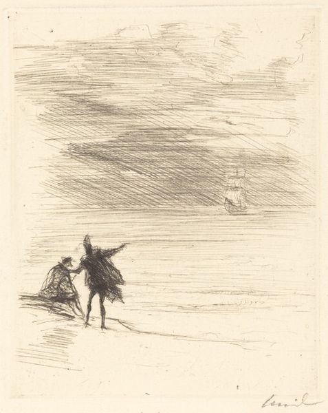 Joseph Pennell made this print of Margate using lithography, a process that relies on the contrast between oily and water-based substances. The image was likely drawn on a stone or metal plate with a greasy crayon, then treated to fix the drawing. Notice how the lithographic process lends itself to a delicate, almost ethereal depiction of the coastal scene. The subtle gradations of tone and fine lines create a sense of atmospheric perspective, drawing you into the vastness of the landscape. It's a process that invites a certain looseness and spontaneity. Although Pennell's materials and processes were those of a fine artist, printmaking has always had a close relationship to wider social issues, notably the world of commerce. The ease with which prints can be reproduced has made them powerful tools for disseminating information. Ultimately, this print reminds us that even the most seemingly straightforward landscape can be deeply embedded in material practices and social histories. By attending to these details, we can gain a richer understanding of the artwork's significance.