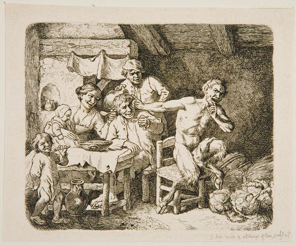 Editor: This is Christian Wilhelm Ernst Dietrich’s "Musical Family," made around 1756. It appears to be an etching, with a real sense of everyday life. What stands out to you when you look at this print? Curator: I'm interested in the labor evident in the printmaking process itself, the techniques Dietrich employs to depict this scene. Think about the physical act of etching the plate and its implications. Editor: How so? Curator: The very act of reproducing music here – consider the cost of this image and how it was distributed. Was it meant for the consumption of the wealthy, or did this method democratize art making? Editor: That's a great point. I never considered the consumption aspect of reproducible art. Curator: Exactly! By considering the means of production, we can learn so much more about the intended audience and the value placed on both art and music.