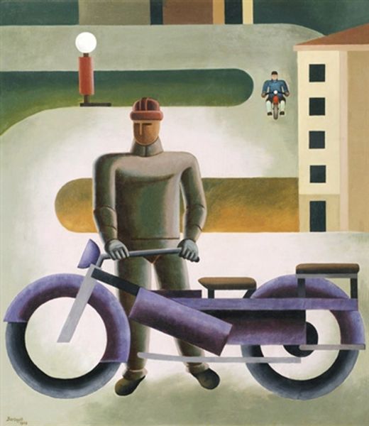 "Külvárosi Táj", or "City Outskirts", was painted in 1927 by the Hungarian artist Sándor Bortnyik. Created in the interwar period, this painting captures the social and economic tensions of the time, reflected in its geometric style and stark depiction of urban life. Bortnyik’s work often explored themes of industrialization and its impact on society. The flattened perspective and simplified forms might remind us of the alienation and dehumanization that can come with modernity, and the way industrial landscapes can erase any sense of personal identity. Note how the architecture looms over the figures, and the dominance of the geometric shapes. Are these houses or workplaces? This adds to a sense of disconnect and perhaps even oppression. The painting leaves you feeling uncertain, caught between the promise of progress and the cold reality of the urban experience.