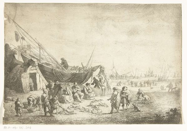 Curator: This sketch, rendered in pencil, pen and gray ink, is entitled "IJsvermaak op een brede rivier", which translates to "Ice Skating on a Wide River." Jan van Goyen created this genre scene in 1653. Editor: There's a coldness that emanates from this drawing, even just in the limited tonal range. I’m also immediately drawn to the material properties suggested: the slick, glassy surface of the ice, the coarse cloth of the figures’ garments, even the smoke seems gritty. Curator: It evokes a quintessential Dutch winter scene, capturing a moment of leisure. But if you look closely at all those people populating the landscape, I notice they are busily occupied. Winter for the Dutch often signifies commerce and travel along waterways when frozen over. Editor: Precisely. The means of transportation becomes novel and changes. Here, boats slide across the frozen water rather than floating in it; the social utility shifts from sailing to skating or pulling others on sleds. Van Goyen seems interested in showing us the seasonal occupation that dictates a different usage of those materials. Curator: These activities symbolize more than mere utility; they carry strong cultural and social implications. The ice, often a symbol of danger and fragility, here transforms into a place for communal gathering, suggesting resilience in the face of harsh nature, in what some have called a "frozen" Golden Age of painting. Editor: So much cultural import derived from simple tools--sleds, skates, even the winter clothes they sport speak of functional adaptation and economic survival within very specific weather constraints. We understand the culture via how they respond materially. Curator: Absolutely, we find how cultural values shape artistic expression. A seemingly straightforward scene reveals complex ties to the Dutch experience, told economically using only the tools needed. Editor: Indeed, a study in how an artist uses basic means to showcase adaptation to environmental and economic needs, reflecting their culture to the very last, economical line.