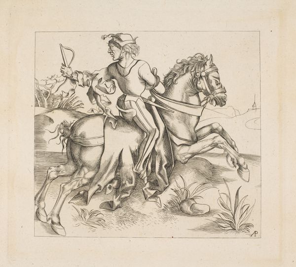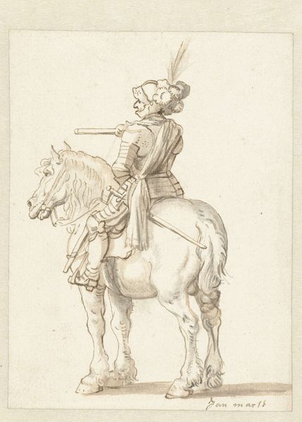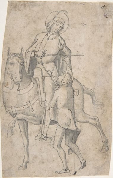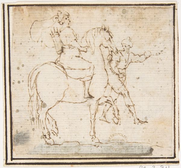 Curator: This drawing, "Man on Horseback, Study of a Man's Head," was created by Marcello Fogolino sometime between 1483 and 1548. It’s currently held at the Metropolitan Museum of Art. Looking at it, I'm struck by its quiet confidence. Editor: My initial impression is less confident, more contemplative, perhaps even melancholy. The figure and his mount seem to be in a world of their own, the lines soft, gestures still, mood reflective, despite the strength implied by the horse. Curator: The horse in classical antiquity and the Renaissance carried connotations of status, nobility, control. Given this symbolic weight, and considering the period, it might signal the power dynamics in society, reflecting a stratified social order. Editor: Precisely, and this reading offers avenues for deeper understanding. The sitter, bearing similarity with an apostle, a saint or even Christ, appears burdened in some respect; the horse thus transforms into the heavy mantle of institutional or ordained authority. Curator: Considering the "Head of a Young Woman" on the verso, it's easy to see it as part of a dialectical game with dualities: power and humility, the masculine and the feminine. Fogolino sets up this symbolic mirroring within the piece itself. It reminds me of similar iconographic practices within illuminated manuscripts from that time. Editor: I wonder about that "recto-verso" opposition, though. It tempts one to essentialize womanhood as automatically humble, as merely the background for supposedly 'important' concerns. Doesn't such division, subtly encoded in the presentation, reflect and then reinforce historical oppression? Curator: It’s a fair point. Perhaps Fogolino was indeed complicit in such projections, which were undoubtedly prominent in his sociohistorical context. Yet, it's still important to see how his personal visual vocabulary negotiated these power dynamics, perhaps unwittingly revealing his internal conflicts or uncertainties. Editor: Exactly! What seems ‘natural’ or given is so often a potent staging ground for unspoken tensions. And studying the iconography, as you mentioned, reveals how those dynamics circulate. Curator: It really enriches how we engage with art, making these older works startlingly relevant. Editor: Agreed; thinking critically and considering varied perspectives gives the drawing fresh relevance even now.