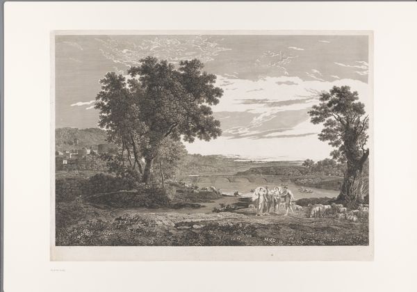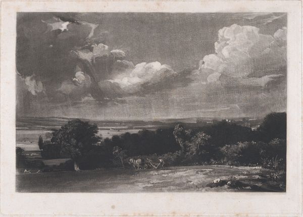 Editor: So, this is David Lucas's "Summer Evening," dating from around 1829 to 1831. It's an etching and print. There's something about the landscape and dramatic sky that evokes a sense of longing, maybe even melancholy. How do you interpret this work? Curator: I see it as a carefully constructed image operating within a very specific art market. Landscapes, especially pastoral scenes like this, gained enormous popularity in the early 19th century, reflecting a romanticized view of rural life promoted by the gentry. Look how even the 'natural' arrangement of trees and grazing cattle is idealized and positioned. This wasn't simply documenting a summer evening; it was presenting an edited, consumable image of rural England that perpetuated a certain vision of its socio-political landscape. Editor: Consumable how? As in, the image itself became a commodity? Curator: Exactly! Prints like this became increasingly affordable and were displayed in middle-class homes. They reinforced ideas of nationhood, social hierarchy, and even the supposed 'natural' order. It's no accident the artist included workers to make it seem normal, peaceful and right. Editor: I hadn’t considered the social aspect before, or how these landscapes played into what people *wanted* to believe. The skies still feel quite romantic, though. Curator: True, the romantic elements served to make it emotionally appealing. That beauty was strategically employed, though. Consider how powerful such depictions were for shaping national identity. What is the legacy of that type of art in photography, television, and movies of our era? Editor: So, while seemingly a peaceful scene, this work reveals layers of social and political meaning, manufactured to be appealing while telling a very specific story. That is fascinating. I will have to be more critical about my immediate "feelings." Curator: Exactly. Consider this landscape and the historical implications and applications within and after the timeframe, you might start noticing this phenomenon is ever-present, everywhere.