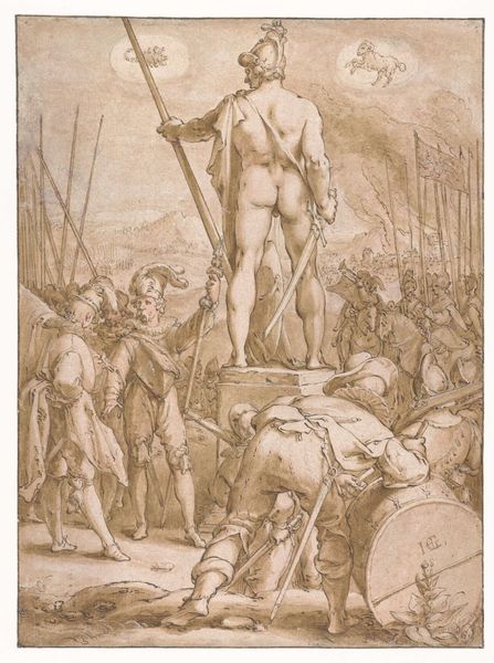 Jan Saenredam made this engraving, “Mars,” in the Netherlands, sometime in the late 16th or early 17th century. It depicts the Roman god of war as a nude statue, standing above a group of armed soldiers. In the context of the Eighty Years' War, when the Netherlands was fighting for independence from Spain, the image of Mars takes on a particular resonance. Statues like this one were often erected in public spaces to remind people of the power of the state. But here, Saenredam shows us Mars with his back turned, as though he is indifferent to the soldiers preparing for battle. The Latin text at the bottom of the image translates to something like: “Through me comes sad death, through me happy victory”. Is Saenredam suggesting that war brings both triumph and tragedy or is he commenting on the futility of war? To understand this work better, we can look into popular political sentiments of the time, as expressed in pamphlets and other artworks. By placing this print within its historical and cultural context, we can begin to understand how it might have been received by its original audience.