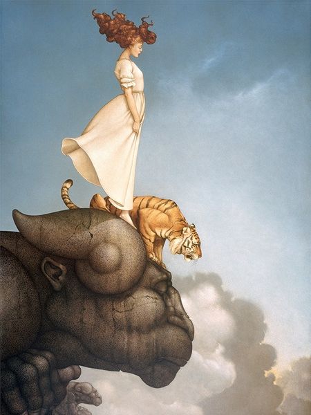 Michael Parkes, born in 1944, created "The Last Lion" using oil paints, layering them to achieve a surreal, ethereal quality. Look closely and you’ll see the smooth, almost porcelain-like finish on the figures contrasted with the rough texture of the rocks. This tension between the real and the surreal is amplified by Parkes' meticulous technique, building up layers of thin glazes to create depth and luminosity. The labor-intensive process mirrors the allegorical content of the painting. The artist’s method requires a commitment to craft, much like the angel's dedication to the lion. Parkes' choice of traditional oil painting situates the artwork within a long history of figurative representation. Yet, it also challenges the contemporary art world's sometimes dismissive attitude towards skill-based practices. This commitment to time-honored techniques elevates the work beyond mere illustration, inviting us to consider the value of patience and precision. "The Last Lion" reminds us that the true meaning of a work of art is found in the convergence of material, process, and context.