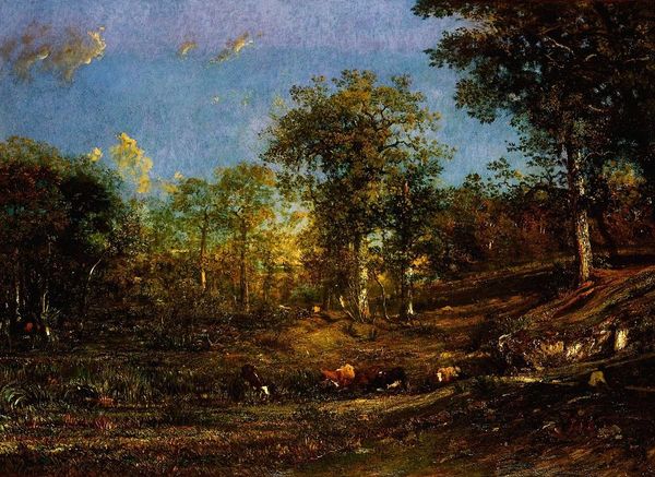Curator: It's quite somber, wouldn't you agree? The muted tones and almost oppressive density of the trees… there's a certain weight to it. Editor: Yes, a real seriousness pervades the piece. What are we looking at precisely? Curator: This is "Edge of the Forest at Fontainebleau, Setting Sun," created around 1850 by Theodore Rousseau. Rousseau was a leading figure in the Barbizon School, known for their dedication to painting en plein air—that is, outdoors, directly from nature. Editor: The landscape genre in that era had very particular connotations. Looking at Rousseau's painting through a postcolonial lens, for example, the "untamed" forest becomes a loaded symbol. Who has access to this "nature?" Who benefits from its resources? Is the very notion of wilderness a construct imposed upon existing communities? Curator: It is oil on canvas. His engagement with the natural world definitely spoke to a broader yearning for authenticity and a retreat from industrialization. Think of the revolutions of 1848; Rousseau and his contemporaries found themselves questioning dominant power structures and seeking solace, perhaps, in a vision of the rural idyll. Editor: And the figures of the animals at the front... what role do they play within that wider reading? Are they simply pastoral markers, confirming nature as harmonious and unspoiled? Or do they gesture to a tension between human intervention and untouched wilderness? Curator: It’s interesting you point that out because Rousseau was refused repeatedly by the Salon. He took great pains to render those very cows that populate his work as something other than anodyne elements. His commitment was to show modern agriculture’s role in the creation of this land that others were using in paintings for sentimental escapism. Editor: Exactly. Because representations of rural life and labor often erased the realities of class struggle, or land enclosures. Curator: What's so striking is the way Rousseau captures light filtering through the trees. This becomes almost a character. Editor: It reminds us of our responsibility, not only in the stewardship of our world, but also when looking at art that involves social or political action, what choices did the painter make and what social, or political circumstances did that decision have.