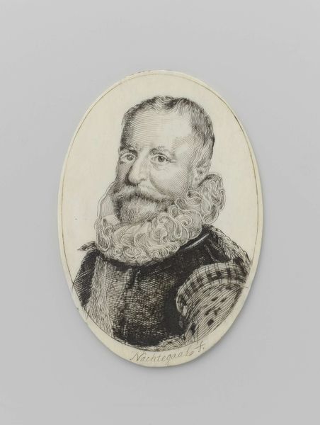 Curator: Here we have a miniature portrait identified as Hugo de Groot, dating roughly between 1600 and 1650. It’s believed to be an engraving. What strikes you first about it? Editor: It's the crisp precision, even at this small scale. The lines are so fine, creating a remarkable amount of detail, especially in the ruff. You can almost feel the starched fabric. What was the purpose of making these kinds of portraits? Curator: Well, these miniatures served multiple roles. Obviously, portraiture was increasingly important to mark social standing, and allowed a broader social reach, as printed engravings facilitated the dissemination of one's image throughout learned society. Editor: Dissemination through reproduction, very interesting. The fact that this image could circulate underscores its function beyond pure aesthetics; it’s about spreading an idea or projecting authority, even for those who weren't the direct commissioners of the piece, which emphasizes that printing democratizes images. Is that correct to assume? Curator: Exactly. Engravings allowed a greater segment of the population to participate in the visual culture of their time. Let's remember that De Groot was an extremely important intellectual, whose image would carry a significant symbolic weight. Editor: It speaks volumes that this image had political reach at the time; there's also the laborious and artisanal work required in producing engravings at scale, which tells of a deep connection to material practice, emphasizing the value society places in manual, skilled labor. Curator: Yes, skilled labor crucial for propagating political and cultural values. But remember, it is not merely a ‘democratization,’ the social class in power decided what to represent and whose faces to circulate. Editor: Good point. It raises a critical point regarding who controlled the narrative. Despite engravings allowing more widespread availability of images, those images still reflected very specific interests and powers, which, even today, dictate what gets reproduced. Curator: And ultimately, the politics behind these historical miniatures are inextricably linked to current power structures shaping what we see and value today. Editor: Definitely a historical lesson on the interplay between production, image, and control that remains so relevant even now.