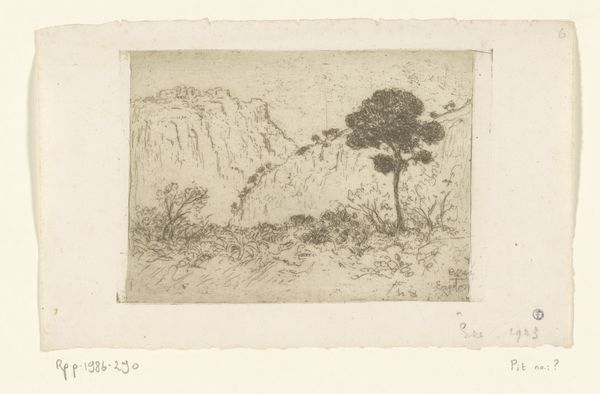 Thomas Moran's etching, "Green River, Wyoming Territory," presents a subdued yet striking vista rendered with meticulous detail. The sepia tones and the fine network of lines across the plate, capture a Western landscape dominated by monolithic rock formations and a serene river. These features evoke a sense of vastness and tranquility. The composition is structured by the contrast between the rugged, vertical thrust of the cliffs and the horizontal flow of the river. This juxtaposition invites us to consider the interplay between permanence and change, the stable geology against the fluid dynamics of nature. Moran uses line and shading to create depth, subtly guiding our eye through the scene. The texture achieved through etching adds a tactile dimension, making the scene almost palpable. Moran's commitment to detail transforms the representational into the symbolic. The landscape isn't just a place, but an exploration of the sublime. Note how the careful arrangement of elements challenges fixed perspectives and encourages an ongoing dialogue between the viewer and the artwork.