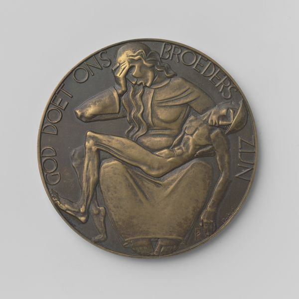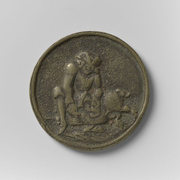 This is a bronze presentiepenning, or gift token, made in Amsterdam in 1751 by Ludolph Cloppenburg for the Spek- en Varkensslagersgilde, which was the local guild of bacon and pork butchers. The medal's small size belies its considerable weight. This heft would have been achieved through a casting process, likely using a mold carved in wood or another relatively soft material. After the metal had cooled, a craftsman would have burnished the surface to bring out the details of the design. The image shows a seated figure, perhaps a representation of Saint Anthony, patron saint of butchers, next to a pig. In guilds like the Spek- en Varkensslagersgilde, a hierarchy of masters and apprentices existed, overseeing all aspects of the trade and setting standards for quality, which in this case, ensured a consistent standard for the slaughtering and processing of pork products. The medal embodies the labor and traditions of the guild members, reflecting the importance of craftsmanship and the regulation of work in 18th-century Amsterdam.