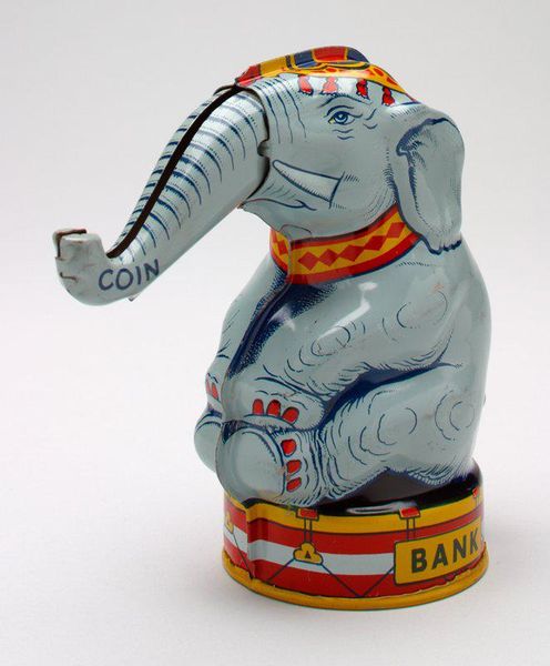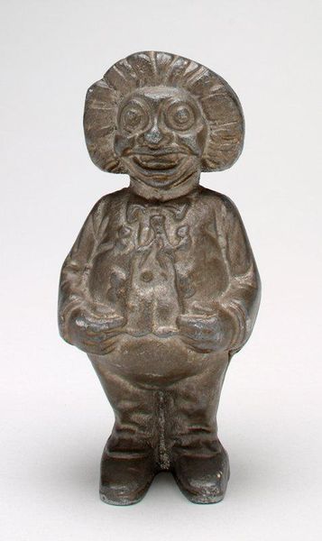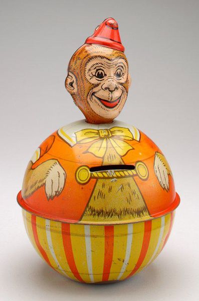 The J. Chein & Company made this "Monkey Tips Hat" mechanical bank, and what strikes me first is the economy of its making. It’s all in the surface, right? This isn’t some deep illusionistic space, but a flat, bright, graphic thing. Look at the way the red and orange clash and vibrate, a bold, almost cartoonish rendering. It is a printed image, yet the details of the monkey’s face suggest the illusion of depth. It creates a visual game, a play between surface and depth. This push and pull reminds me of Elizabeth Murray's sculptural paintings, where she also teases our perception of space. Like Murray, J. Chein & Company knows how to make a surface sing! Ultimately, it’s this simplicity that gives the work its charm, its ability to speak across time.