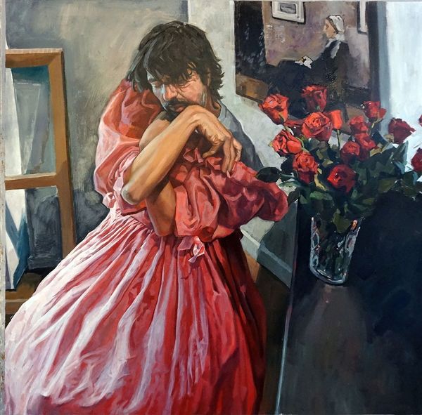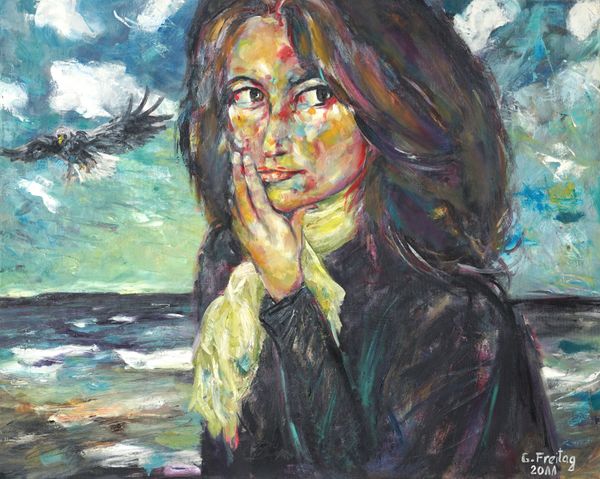 Curator: Charles Blackman created this intriguing oil painting, "Check Cloth," in 1961. I'm struck immediately by the patterns; they seem almost to vibrate. Editor: Vibrate is right. There's an intense, almost melancholic feeling evoked for me by the hunched figure in contrast with such an aggressively colourful surface design. Curator: I think that interplay is deliberate, yes. The checked fabric, echoed on the table and clothing, frames the solitary figure. It creates a contained domestic sphere—almost trapping, though—that seems to emphasize her introspective state. Editor: Do you think the ‘check’ itself functions as a constraint on expression? I wonder if Blackman might be commenting on societal expectations placed on women during that era. Curator: That's interesting. I tend to focus on how the repetition of patterns provides a structure, even when life feels chaotic. We look to symbols for meaning. Consider also that checkerboard patterns, historically, are linked with fate or games. It makes me wonder what "game" the sitter feels trapped within. Editor: Or maybe what game she refuses to play. There is defiance in the set of her mouth, perhaps. And the colour feels almost Fauvist. It’s pushing at the seams of social conformities. Curator: Perhaps both are simultaneously true: she's caught, and resistant. Look at her gently crossed arms – almost shielding herself but simultaneously calm. The choice of oil paints here, laid on with visible brushstrokes, intensifies that ambivalence, suggesting inner emotional turbulence, yes? Editor: I see that now – it also reminds us this is mediated experience - oil paint, canvas. What really stands out for me is how Blackman used patterns to question, to some extent, women's roles and spaces, beyond just an attractive surface detail. Curator: So, "Check Cloth," beyond being a fascinating piece of artwork on the canvas, serves as a striking emblem of the tensions women encountered during its historical period. Editor: Exactly. I think that adds to the power of this work - a real visual signifier of that turbulent push and pull, I love how the colours feel celebratory and fun, while actually describing someone withdrawn and feeling alone.