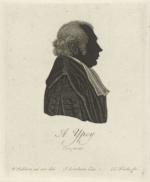 Curator: This piece, currently housed in the Rijksmuseum, is a silhouette portrait of Adriaan Gilles Camper, created in 1814. It’s an engraving—note the crispness of the lines. Editor: My first thought is restraint. There’s a stoic stillness, a certain intellectual weight. The dark silhouette against the paper conveys power simply. Curator: Yes, the power of negative space is utilized effectively here. Silhouette portraits were quite popular in the late 18th and early 19th centuries as a more affordable alternative to painted portraits. They offered a sense of immediate recognition. Notice the sitter’s meticulously rendered coat and cravat, how his status is materially present through clothing. Editor: Engravings allowed for broader distribution of images, a democratization of portraiture in a way. But I also see the labor involved: the precision required to create such fine lines with a burin. Curator: Absolutely. The linear style and emphasis on form align with the Neoclassical revival, referencing the clarity and order of classical art. In this profile we can see the emergence of the scientific paradigm focused on observable attributes and categories. Do you agree? Editor: I do, and while silhouette might appear to simply flatten detail, observe how the engraver distinguishes between surface textures like the rough curly hair against the smoother fabric, elevating what may seem to be a simple dark mass. These details must take considerable skill and time. Curator: Indeed. And the profile itself – the nose, the line of the jaw – speaks to a particular understanding of physiognomy prevalent at the time. It becomes more than just a likeness, but a claim about character. What stories can an economic format and style provide to future viewers of status? Editor: Seeing this reminds me of the long process behind making a seemingly straightforward image: the mining of the metals for tools, the preparation of the plate, the press printing numerous examples from the laboriously engraved line. It's about accessing people through reproducibility and social distribution of affordable goods. Curator: Fascinating to consider how this seemingly simple portrait, born from specific material conditions, conveys layers of symbolic meaning. Editor: Absolutely, highlighting both accessibility through its medium and the artistry hidden within those clean lines.
