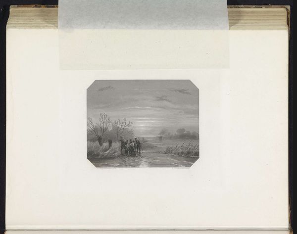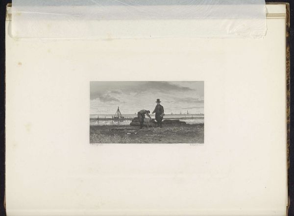 Curator: Here we have "The first windmills in Holland, 14th century," an etching by Willem Steelink from between 1865 and 1870. Editor: Oof, it's got that wistful quality. Kind of melancholic, like looking back on a simpler time that maybe wasn't so simple after all, you know? Curator: The Dutch Golden Age, a powerful source of cultural identity. The windmills themselves are not just functional, but deeply symbolic, becoming emblems of Dutch ingenuity, resourcefulness, and the eternal struggle against the water. Editor: Yeah, they do stand there defiant, almost like watchful guardians. Is it just me or does that sky feel a bit threatening, hanging over those sturdy little mills? It's beautifully rendered though, a kind of dreamy realism. Curator: Indeed. Windmills predate the Dutch Golden age but continue their symbolism representing human power over nature, specifically transforming natural forces into energy that propels life. Notice how Steelink evokes both the industriousness and the vulnerability of the community relying on this technology? The human figures at the base provide a real sense of scale. Editor: I guess there's also this…echo of a pastoral fantasy. It feels romanticized, removed, you know? Like an ancestor remembering a thing rather than a thing itself, as they say. Like someone wanted very hard to picture themselves belonging to this story. Curator: An interesting point, suggesting the very human act of creating one's identity within a historical context. Editor: So it's more than just picturesque countryside, it's loaded with meaning, the engine and backbone of community, struggle, remembrance. And those romantic grey washes lend it that wistful distance. Thanks! I love having that unpacked. Curator: My pleasure. By observing how artists engage with such familiar images, we gain valuable insight into what resonates and persists across time, thus gaining greater empathy and appreciation.