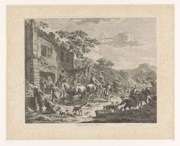 Editor: So, this is Léopold Flameng's "Boerenkermis," created in 1855 using etching. It feels like a snapshot of community life, but there’s also this sense of hierarchy in where people are positioned and what they’re doing. How do you interpret this work through a more critical lens? Curator: It's intriguing you pick up on that hierarchy! Consider the historical context: mid-19th century Europe, marked by class divisions, rapid industrialization, and shifting social structures. How do you think Flameng's portrayal of a rural festival reflects or possibly critiques those power dynamics? Editor: I guess the musicians on the elevated platform and the observing figures positioned around the periphery seem to reinforce the class separation, almost as though they’re above the fray. Is this kind of depiction common for the time? Curator: Genre paintings, depicting scenes of everyday life, were popular, but often romanticized. Flameng's piece, though technically skilled, invites us to question this romantic vision. Think about whose perspective is privileged here? Who gets to participate, and who is relegated to the margins? Editor: It’s like he's showing us a constructed reality rather than the messy truth. The people dancing look carefree, but the composition itself feels…controlled. Curator: Precisely! This "control" is key. Whose stories are being told and, perhaps more importantly, whose stories are being omitted or silenced? Where are the women, and how are they presented? Consider their roles versus the roles of men, who are primarily centered stage, active and joyous in their dance. Editor: I see what you mean. It does feel like women are shown in traditional, passive roles. The mothers, observers...It is almost a demonstration of an established social structure rather than just an idyllic celebration. I'll certainly see this differently from now on! Curator: Exactly, it encourages a re-evaluation, and it goes to show that historical awareness enriches our reading of visual cues and assumptions of all art. Editor: Thanks! This makes the artwork even more engaging than before.