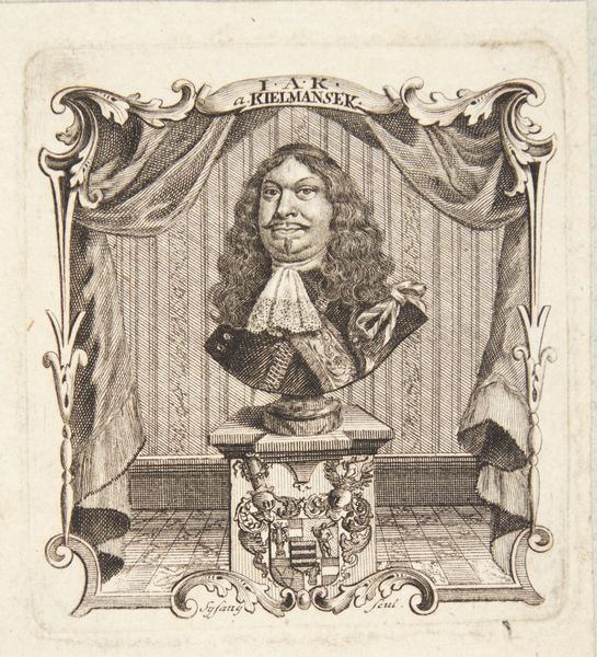 Curator: At the Rijksmuseum, we find "Portret van Eiler Holk", a baroque engraving by François van Bleyswijck, placing us roughly in the late 17th to early 18th century. What is your first take? Editor: It's undeniably ornate, and quite layered—almost crowded. The composition presents several portraits contained within another ornamental frame, complete with weaponry and heraldry. Curator: Let’s look at its construction. Van Bleyswijck balances two forms of portraiture: one is a traditional bust in the upper-left corner and, the second, is a life-size portrait centrally framed and positioned above Holk’s coat of arms. Both feature similar landscape backdrops which add to the density of the work. Editor: Indeed. The density itself is interesting. What sociopolitical statement is made through the visual clutter? It seems like Holk is almost attempting to legitimize himself within that artistic and visual lineage. Curator: Consider the iconography as deliberate symbolism—the draped weaponry as evidence of a life spent in martial pursuits; two, semi-nude figures flank his coat of arms… it underscores power, ancestry, and legitimacy. Editor: Precisely. It speaks volumes about how historical figures consciously curated their public image. Bleyswijck's engraving technique would have afforded multiple impressions, increasing the public dissemination of Holk's curated persona. Curator: The formal presentation also gives an illusion of three dimensions. See the carefully placed shadows that fall within each portrait and across the instruments of war. The contrast is quite masterful! Editor: Right! Considering that the artwork originated as a print—probably functioning as part of larger collection, it stands out because it showcases the artist's awareness of historical contexts to deliver specific sociopolitical messages. Curator: So, despite the surface-level formality of it all, the artistry in this portrait pushes it past mere record-keeping; it truly encapsulates the political motivations inherent in commissioning such work. Editor: Ultimately, the portraits by Bleyswijck invite us to consider the calculated effort individuals undertook to fashion and disseminate specific legacies, and the institutions in place to do it.