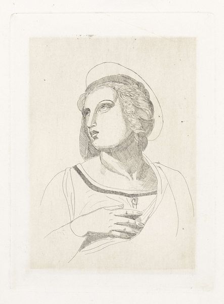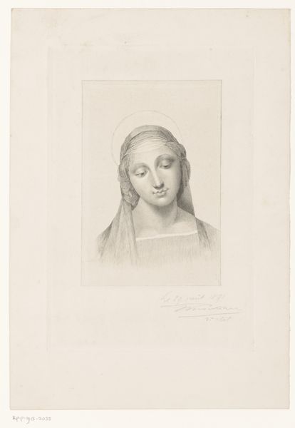 Curator: Looking at this drawing by Georges Montenez from 1891, entitled "Head of Mary with Nimbus", I’m struck by how powerfully it evokes familiar religious iconography through very simple means. What’s your initial reaction? Editor: Melancholy. There’s a quiet sorrow emanating from her downward gaze, almost as if she’s already aware of what awaits. And the subtle rendering in pencil on paper intensifies that feeling of vulnerability. Curator: Indeed. The use of pencil softens the visual impact and draws us into the emotion. And the halo isn’t overly assertive, either, it’s just a soft glow suggesting divine status, allowing Mary's humanity to take center stage. Think about how effectively symbols often carry complex emotional information, bridging religious doctrine and human experience. Editor: Absolutely. It’s a masterclass in controlled emotion. What I find interesting from a historical perspective is that this was done in 1891. Academic art was waning at this point, and yet Montenez leans into traditional aesthetics, inviting questions about the role of religious art in secularizing societies. Curator: Good point! The drawing's academic style clearly harkens back to Renaissance depictions, creating a sense of timelessness. It's worth thinking about how such imagery reinforced and circulated certain notions of idealized beauty and motherhood during this time. The downward cast eyes have come to carry that feeling. Editor: Yes, there is an appeal to pre-modern forms present here. Consider too, what choices Montenez had. Photography was gaining momentum and yet this highly reproducible medium wasn’t considered ‘art’. By focusing on this, it shows us how important this older visual tradition of drawing, and particularly of religious drawing, was at the end of the 19th Century. Curator: Exactly! So, a piece like this resonates because it accesses and recirculates iconic imagery. And it brings up complex cultural forces swirling about, too. The drawing gives us much to consider about symbolism and how older imagery still felt contemporary in a society becoming thoroughly modern. Editor: Indeed, and its success shows how tradition adapts to and dialogues with the present. Curator: Beautifully said. A small sketch, yet packed with historical and psychological significance.