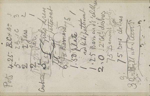 Editor: So, this is *Berekeningen*, or "Calculations," by Carel Adolph Lion Cachet, made around 1905 or 1906. It’s an ink drawing on paper held at the Rijksmuseum. It's... minimalist, I guess? Just some handwritten numbers and symbols. What can you tell me about it? Curator: What a deceptively simple piece! These aren't just random numbers; they are symbols holding encoded information, perhaps acting as a mnemonic device for an artistic idea. How do they strike you emotionally? Editor: Emotionally? I don’t know…detached? Technical, maybe? Like notes for something else. Curator: Precisely! Consider how Cachet might have intended this "behind-the-scenes" glimpse. Artists often employ geometric forms and mathematical proportions to convey underlying harmony. What historical symbolism might numerical sequences evoke? Editor: Ummm…like the Golden Ratio, or maybe religious symbolism like the Trinity? Curator: Excellent. Notice also the texture of the paper itself. Its very presence evokes a specific time, a place of study or contemplation. Does that shift the feeling for you at all? Editor: I see what you mean. It's like finding a page torn from a sketchbook, hinting at a bigger picture, more complete and structured somewhere out there. A lost narrative. Curator: Yes, fragments! Numbers, divorced from the outcome of their equation, become cyphers themselves. It's about an unfinished act, a code seeking to be resolved. And that tension...that’s where the emotional weight resides. Editor: It’s amazing how much can be gleaned from something so simple. Now I see it’s more than just numbers on a page. Curator: Indeed! Sometimes, the smallest, seemingly insignificant symbols contain the grandest narratives and most compelling emotions.