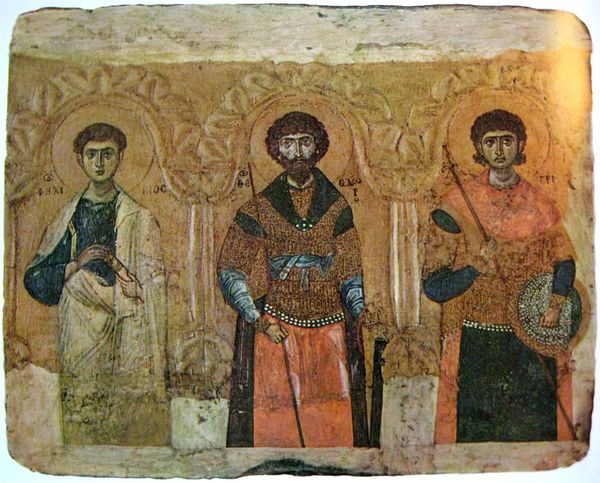 Editor: This tempera on panel, created around 1195, is titled "Saints Paul, James the Elder, Stephen, Lawrence, Martin of Tours, Leonard of Limoges." I'm struck by the way the figures seem to float against the gold backdrop, almost suspended in time. How would you interpret the iconography here? Curator: This image is dense with symbolism, carefully constructed to evoke specific emotional and spiritual responses. Each saint, identifiable by particular attributes – like Paul's book or Martin's bishop attire – contributes to a larger narrative about faith and virtue. Do you notice how their gazes draw you in, yet their postures are relatively static? Editor: Yes, there's a sense of formality, but also an intense engagement. The colors are rich, especially the reds and blues. Are there any repeated symbols across the Saints? Curator: Precisely. That controlled tension is a hallmark of Byzantine art, and serves to create an atmosphere of reverence. Consider the deliberate placement of hands in blessing or holding sacred objects; these are potent symbols of divine authority and intercession. Their frontal presentation emphasizes direct communication with the viewer. Notice also the use of hierarchic scale – where the more important figures might be slightly larger. What do you make of the gilded background? Editor: It seems to represent the divine, illuminating the figures from behind. This painting has a real depth and sense of purpose. Thanks for showing how symbols were used in medieval painting to impact and instruct the viewer. Curator: Indeed. It's about unlocking those encoded meanings and understanding the ongoing influence and cultural memory preserved through such enduring visual forms.